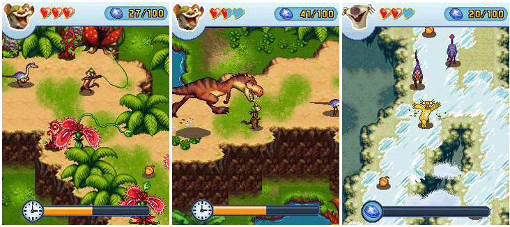 Pero, ¡cuidado!: encontrarás plantas carnívoras, fosas letales de alquitrán, lava al rojo vivo y nuevos depredadores prehistóricos a medida que avances por el mundo perdido. Cada nivel cuenta con nuevos desafíos, pero no pasa nada, ¡los personajes de Ice Age están ahí para ayudarte! ¡Continúa con tu aventura mientras la Edad de hielo pasa a la Edad de los dinosaurios!