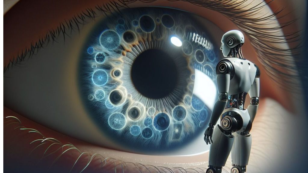 robit ia se enfrente a un ojo humano de fondo que vigila (Foto: DALL·E ai art)